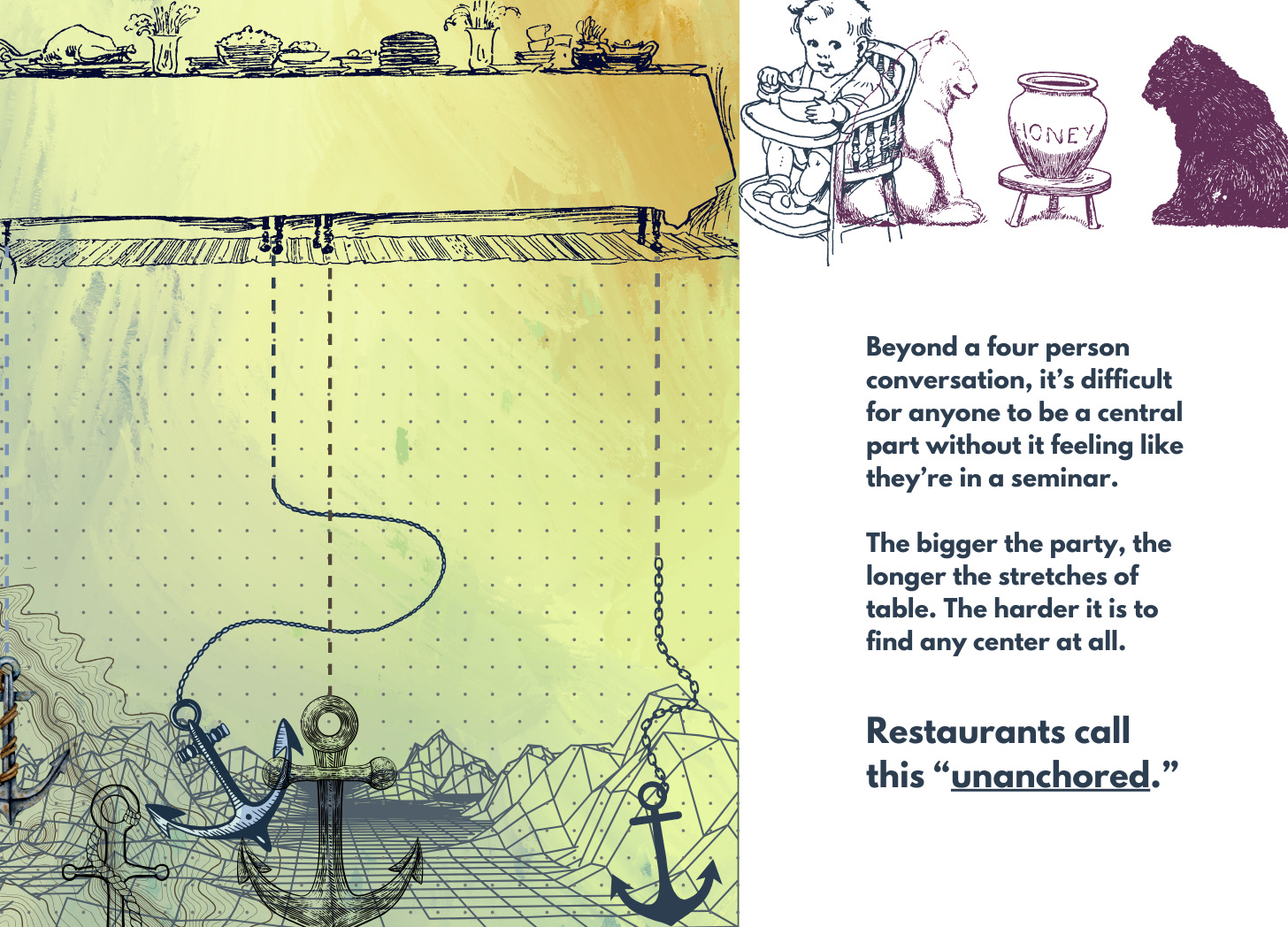 At dinner, questions that were adrift, are now ashore. Even between the spoonfuls of the savory and the bitter. Even if the final answer to any of our questions are harsh. And even if, during this interchange, we are the fated recipient or the burdened deliverer—of a polite kill.