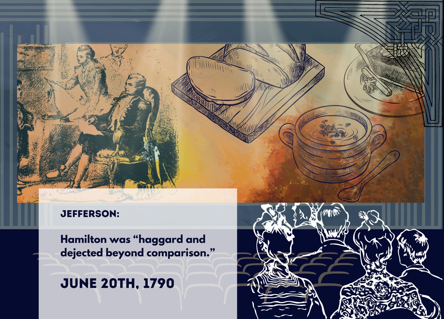 Alexander Hamilton, Thomas Jefferson, and Madison, on the night of June 20th, 1790, had to decide where the permanent US capitol should be. According to Jefferson, Hamilton was “haggard and dejected beyond comparison.”